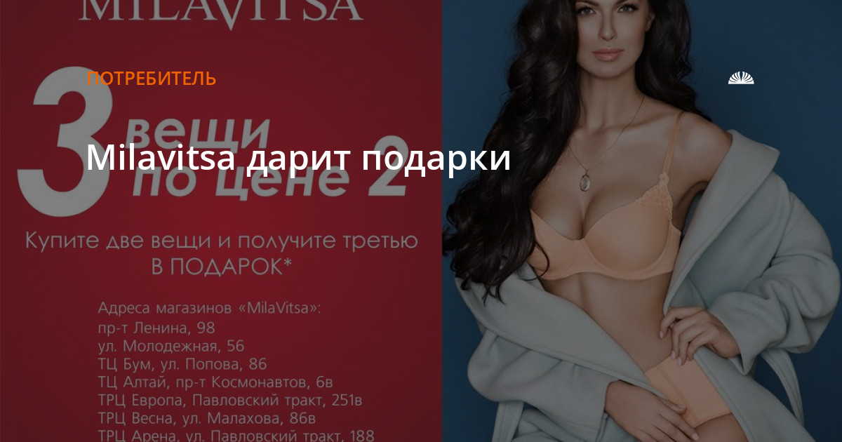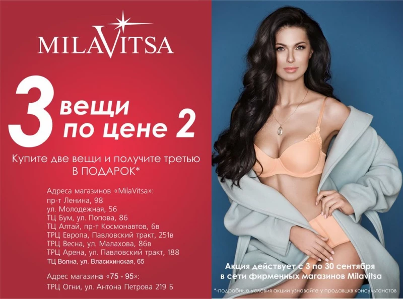 В сентябре сеть фирменных магазинов нижнего белья Milavitsa приготовила подарок для своих клиентов. Акция во всех магазинах сети. Весь сентябрь при покупке двух вещей третью мы вам дарим! Просто купите две вещи и получите еще одну на ваш выбор совершенно бесплатно. Выбирайте из всего ассортимента, представленного в магазинах Milavitsa: классическая и модная коллекция, повседневное белье и купальники. Главное запомнить – покупая две вещи, третью получите в подарок. Самую полную информацию об акции, а также о других акциях и программах вы можете узнать по телефону (3852) 611-012.