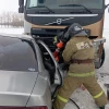 Сильная деформация кузова легковушки заблокировала людей внутри. Сотрудники МЧС применили гидравлический инструмент и деблокировали пострадавших из смятой легковушки.