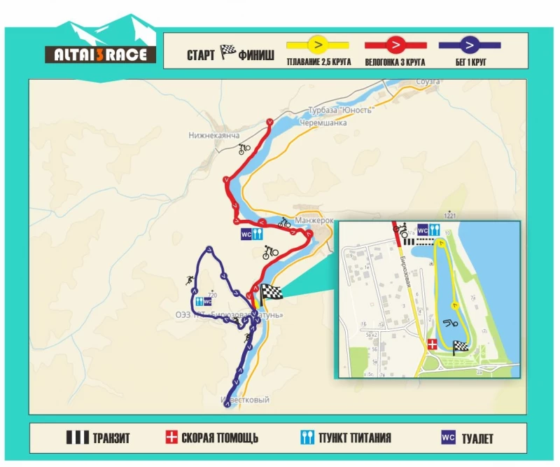 Самая длинная дистанция по триатлону называется Ironman (от англ. "железный человек"). На ней надо проплыть 4 км, проехать на велосипеде 180 км и пробежать 42 км. Ее нужно пройти не более чем за 17 часов. На Алтае соревнования пройдут на "полужелезной дистанции", то есть все этапы будут в два раза короче, максимальное время для прохождения всего пути — 8 часов. Участвовать могут мужчины и женщины не младше 18 лет в индивидуальном и эстафетном формате.