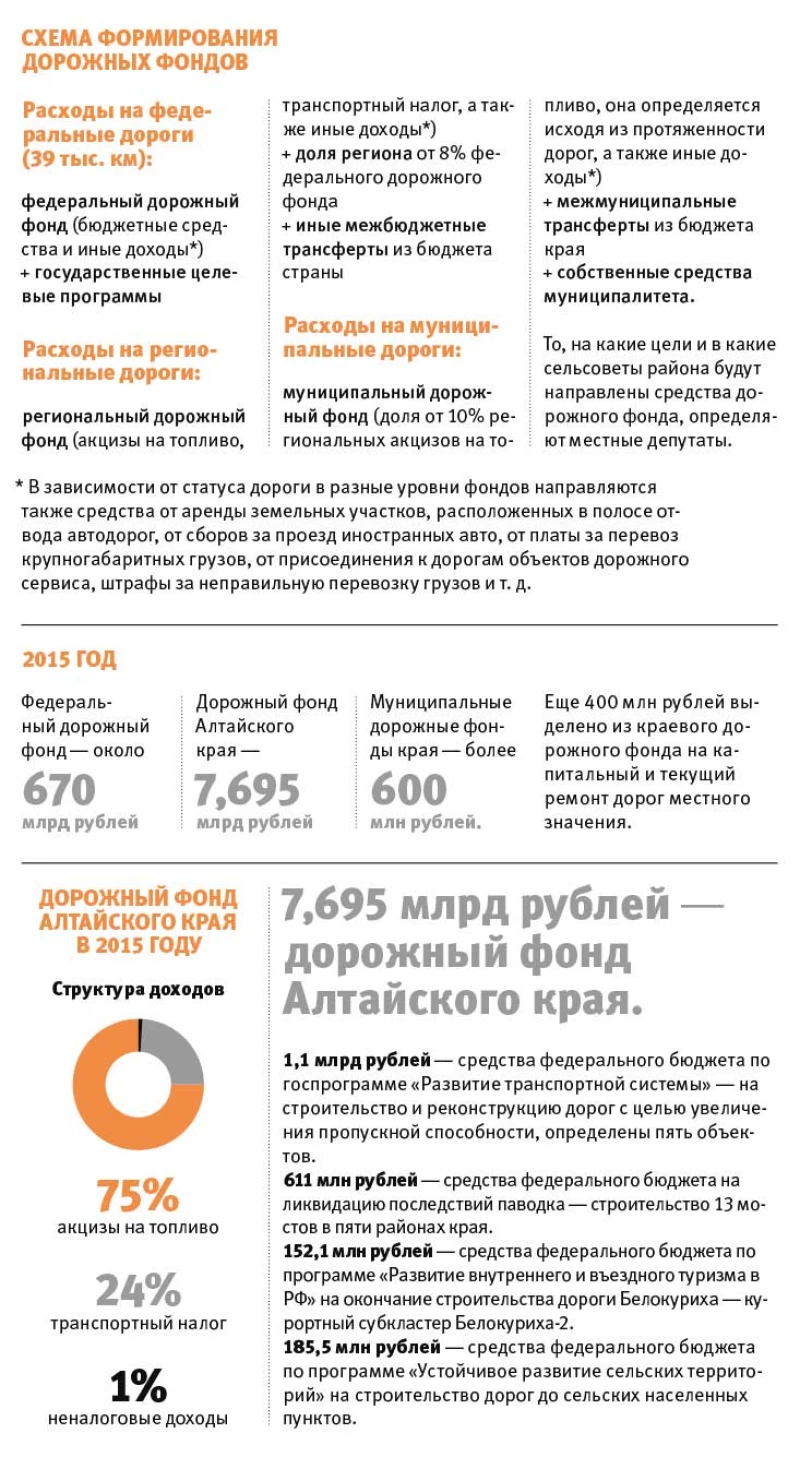 В Главстрое полагают, что муниципалитеты, особенно крупные города, обязательно должны выделять дополнительные средства из своих бюджетов. Так, в Барнауле в 2015 году планируют потратить около 800 млн собственных средств на дорожное хозяйство, в Бийске — 173 млн, в Рубцовске — 35 млн.