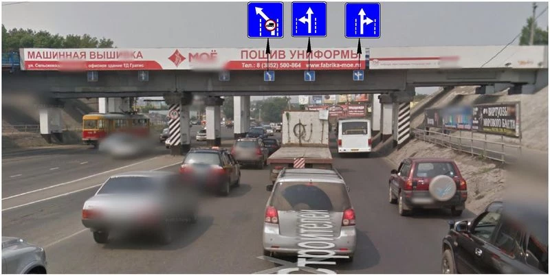 Сейчас с данного направления на Павловский тракт можно повернуть с крайнего левого и среднего ряда, на ул. Советской Армии двигаться прямо со среднего и крайнего правого ряда. До этого со среднейго ряда можно было уйти только налево, а с крайнего правого ряда можно было повернуть налево. При этом многие водители нарушали правила и поворачивали на улицу Советской армии со среднего ряда.