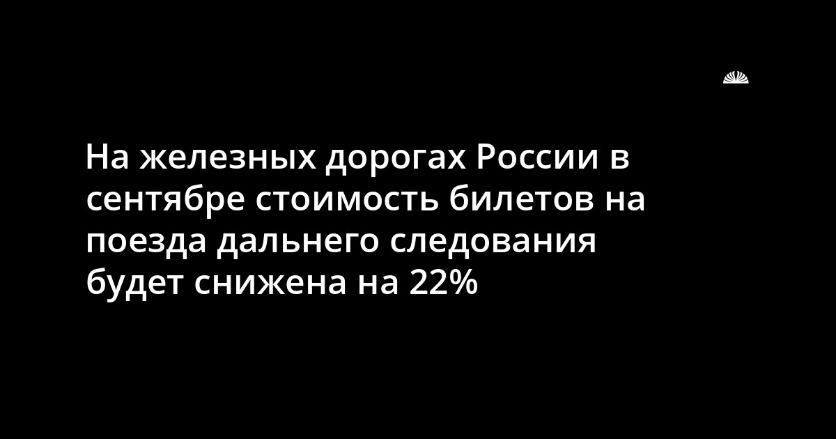 Пока владельцы самолётов размышляют, как бы сделать перелёты подороже, на железных дорогах России в сентябре стоимость билетов на поезда дальнего следования будет снижена на 22%. Данные тарифы будут действовать в период с 1 по 30 сентября. Снижение цен проходит в рамках графика гибкого регулирования тарифов на перевозки пассажиров в дальнем сообщении. Следующее снижение тарифов на проезд в пассажирских поездах дальнего следования произойдет 1 октября.