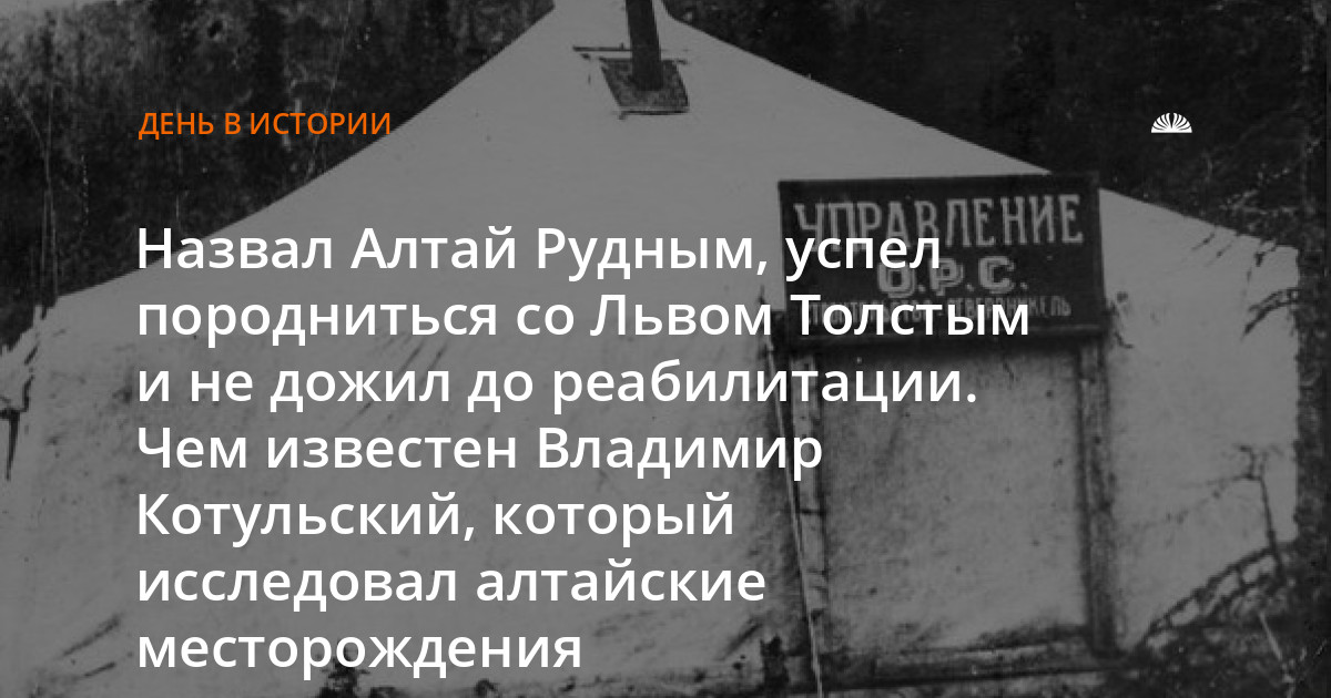 Именно Владимир Котульский назвал юго-западную часть Алтая Рудным Алтаем. Это понятие прочно вошло в научный обиход.