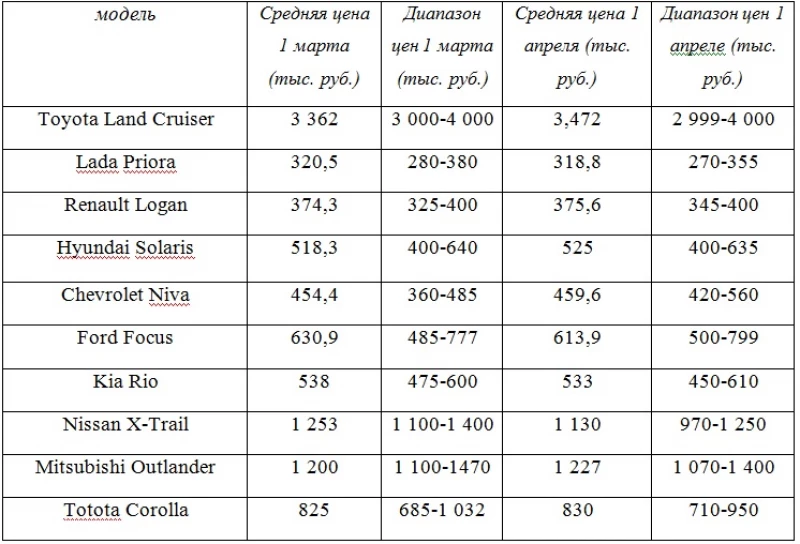 Для мониторига цен мы выбрали десяток наиболее популярных моделей разных производителей в разных ценовых сегментах. 1 марта мы на основе опубликованных на сайте drom.ru объявлений посчитали среднюю стоимость предложений по этим моделям и записали диапазон цен. Месяц спустя, 1 апреля мы повторили эту процедуру. Обратите внимание, что мы смотрели только объявления по продаже машин, выпущенных в 2012 году: именно "трехлетки" чаще всего становятся предметом сделок на вторичном рынке.