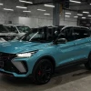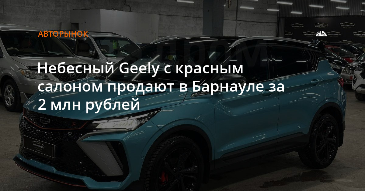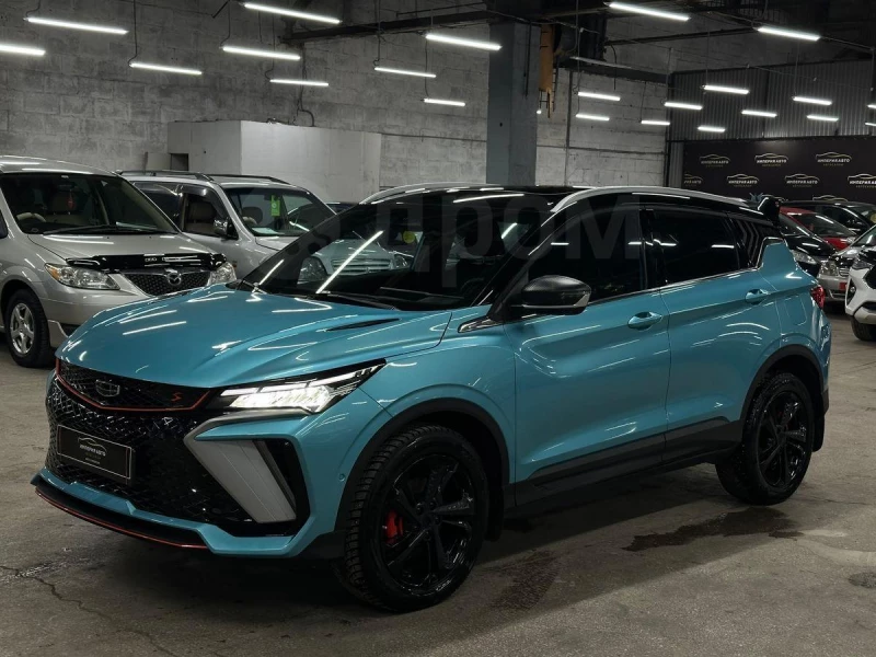 Цвет автомобиля заявлен «голубым», а выглядит он скорее как небесный. При этом практически весь салон черный, но есть и ярко-красные вставки. У Geely Coolray есть люк, также сенсорная консоль.