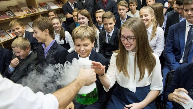 В завершении развлекательной программы школьники стали свидетелями шоу сумасшедшего профессора Николя, в котором они с удовольствием принимали участие. Это эксперименты с сухим льдом, создание "газировки", разделение луча света на спектр и даже подрыв "дирижабля". В общем, мероприятие прошло в традициях классика приключенческой литературы, предсказавшего не одно научное изобретение. Самые активные и любознательные участники получили призы от компании "Ростелеком" и книги.