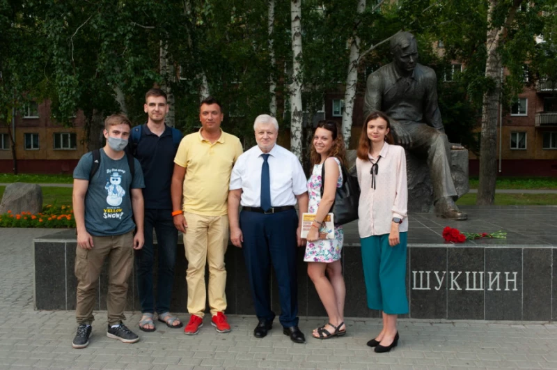 После рабочего дня Сергей Миронов возложил цветы к памятнику Василию Шукшину в Барнауле.