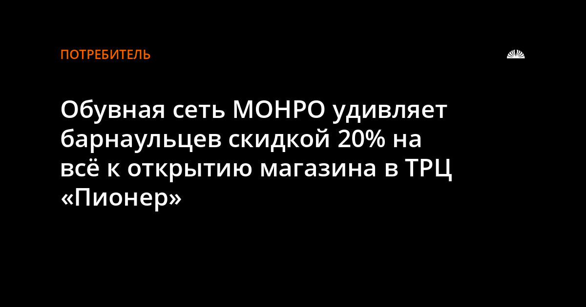 *На весь ассортимент магазина обувной сети «МОНРО» по адресу: Ленина, 102 В, ТРЦ «Пионер», 3-й этаж предоставляется скидка 20%. Скидка по акции не суммируется со скидкой по дисконтной карте. Сроки акции: с 26.09.2018 по 24.10.2018 г. Подробности у продавцов-консультантов.
