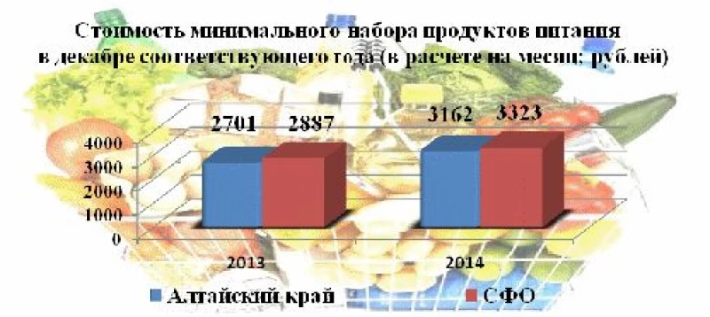 В Алтайском крае минимальный набор продуктов питания за 2014 год подорожал на 461 рубль и составил 3162 рубля, сообщает краевое управление по пищевой и перерабатывающей промышленности. В рейтинге по этому показателю среди 12 регионов край занимает десятое место в Сибирском федеральном округе, то есть только в двух сибирских регионах минимальная продуктовая корзина дешевле, чем у нас.