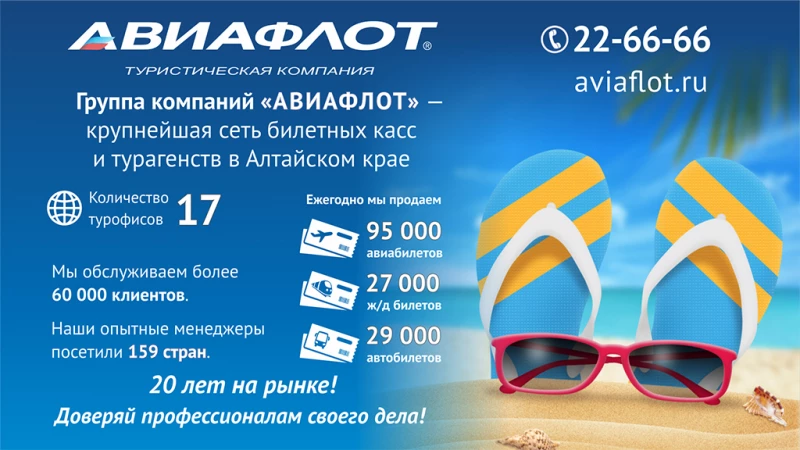 Группа компании "Авиафлот" — крупнейшая сеть билетных касс и турагентств в Алтайском крае.