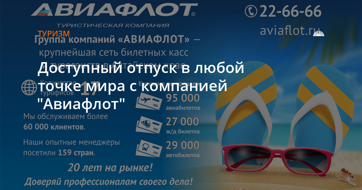Зачастую люди не владеют информацией о предложениях летнего турсезона, поэтому отказывают себе в таком отпуске. Сотрудники группы компаний "Авиафлот" ежедневно предоставляют клиентам оперативную и актуальную консультацию об отдыхе за границей и внутри страны и помогают бронировать авиабилеты и туры по выгодной цене. Купить путевку стало доступнее — клиент может сам сформировать заявку из собственных предпочтений.
