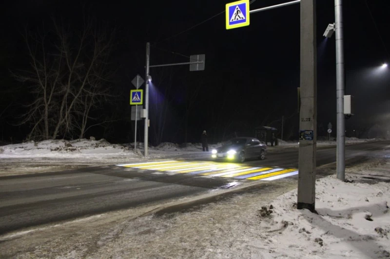 Комплекс «Аврора V» меняет подход к переходам — проектор на опоре в сумерках рисует яркую «зебру» на асфальте. Она видна на снегу, мокром асфальте за 150-200 м, адаптирует яркость и подсвечивает пешехода даже в темное время суток.