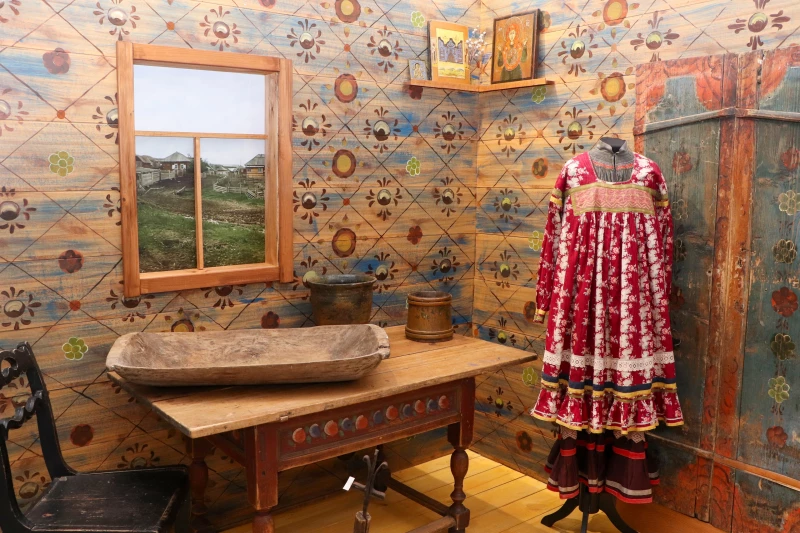 Центральный художественный прием — воссозданные интерьеры изб. И это не декоративный элемент, а ключ к пониманию различий между старожилами и переселенцами.