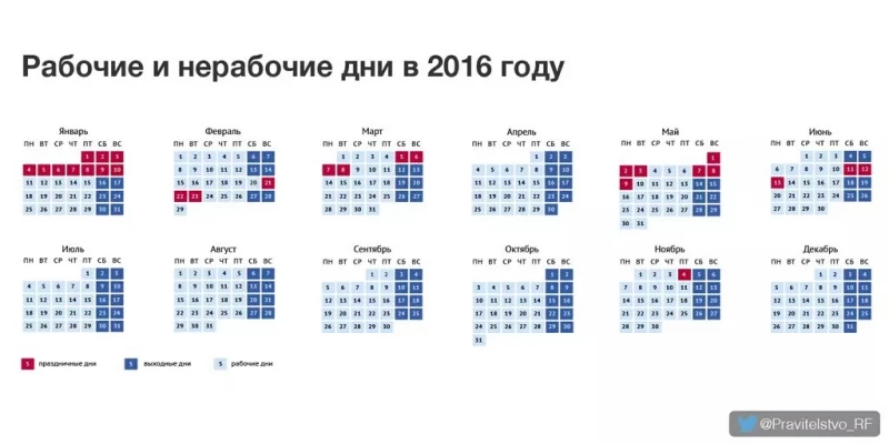 Таким образом, в январе 2016 года будет десятидневный отдых, совпадающий с новогодними каникулами и Рождеством Христовым, в феврале – трёхдневный отдых, совпадающий с празднованием Дня защитника Отечества, в марте – четырёхдневный отдых, совпадающий с празднованием Международного женского дня.
