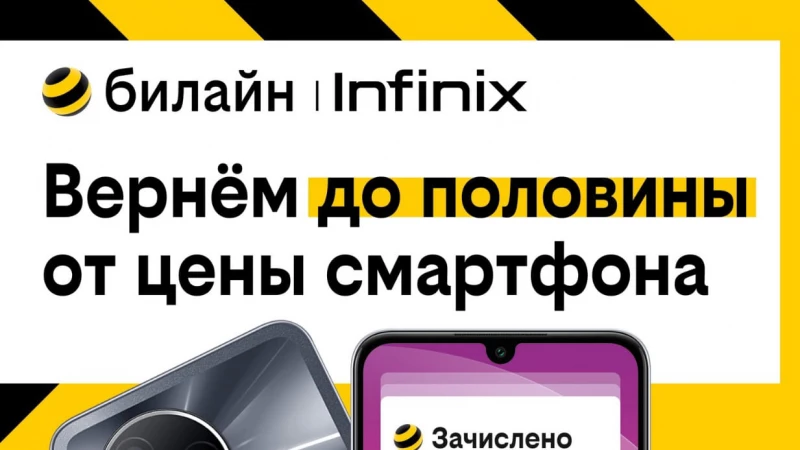 Специальное предложение распространяется на десятки моделей смартфонов брендов Infinix, Tecno, Xiaomi и realme. При оформлении покупки клиенту билайна будет возвращено на баланс телефона до половины цены устройства в виде бонусных рублей. Максимальный размер такой выгоды — 10 тыс. рублей, точный размер бонуса зависит от выбранной модели смартфона.