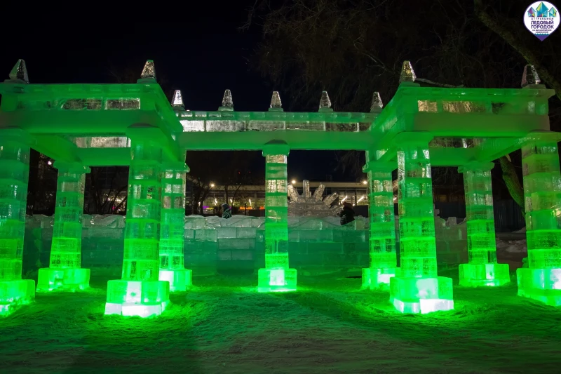 Он находится на Михайловской набережной. Каждый год там возводит ледовые скульптуры частная компания. Поэтому вход в ледяное царство платный.