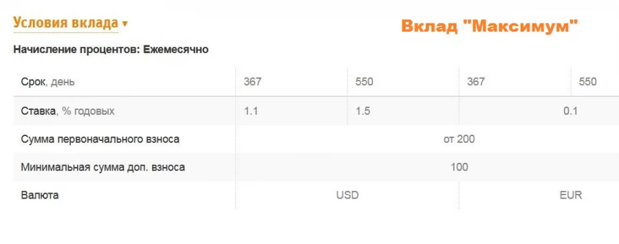 Дополнительные условия вклада "Максимум": открытие вклада в Интернет-банке - возможно (вклад называется "Максимум- онлайн"); порядок выплаты процентов - ежемесячно путем выплаты процентов по вкладу на отдельный текущий счет в Банке; пополнение возможно, но доп. взносы не принимаются, если до окончания вклада осталось: при сроке вклада 367 дней – менее 6-ти месяцев и при сроке вклада 550 дней – менее 12-ти месяцев; расходные операции - не допускаются; перезаключение вклада на новый срок (пролонгация) - допускается; условия досрочного расторжения вклада и снятия средств: 2/3 ставки по вкладу, действовавшей на дату открытия вклада, для сумм взносов денежных средств, находящихся на счете вклада более 270 дней на момент расторжения договора и ставка вклада "До востребования" для сумм взносов денежных средств, находящихся на счете вклада 270 дней и менее на момент расторжения договора.