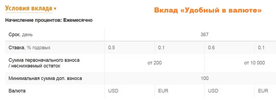 Дополнительные условия вклада "Удобный в валюте": открытие вклада в Интернет-банке - возможно (вклад называется "Удобный в валюте - онлайн"); порядок выплаты процентов - ежемесячно путем причисления к сумме вклада (капитализация); на момент начисления и выплаты процентов: при нахождении денежных средств на счете меньше 7 дней, проценты начисляются по ставке "До востребования"; если денежные средства находятся 7 дней и более на счете, то проценты начисляются по ставке вклада (с первого дня размещения денежных средств); пополнение - допускается; расходные операции - допускаются в части сумм, превышающих величину неснижаемого остатка; перезаключение вклада на новый срок (пролонгация) - допускается; условия досрочного расторжения вклада и снятия средств: выплаченные Вкладчику проценты не пересчитываются и сохраняются в полном объеме, проценты за период с даты последней выплаты до даты расторжения вклада выплачиваются по ставке вклада "До востребования".