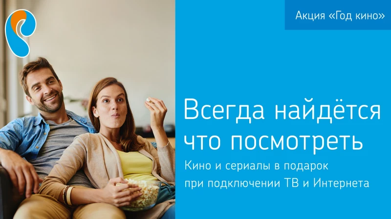 * Заявку на участие в акции "Год кино" можно оставить на сайте www.rt.ru, позвонив на бесплатный круглосуточный номер 8-800-100-0-800 или зайти в ближайший центр продаж и обслуживания "Ростелекома". Услуга доступна при наличии технической возможности. Маркетинговая акция "Год кино" проводится на всей территории Российской Федерации.