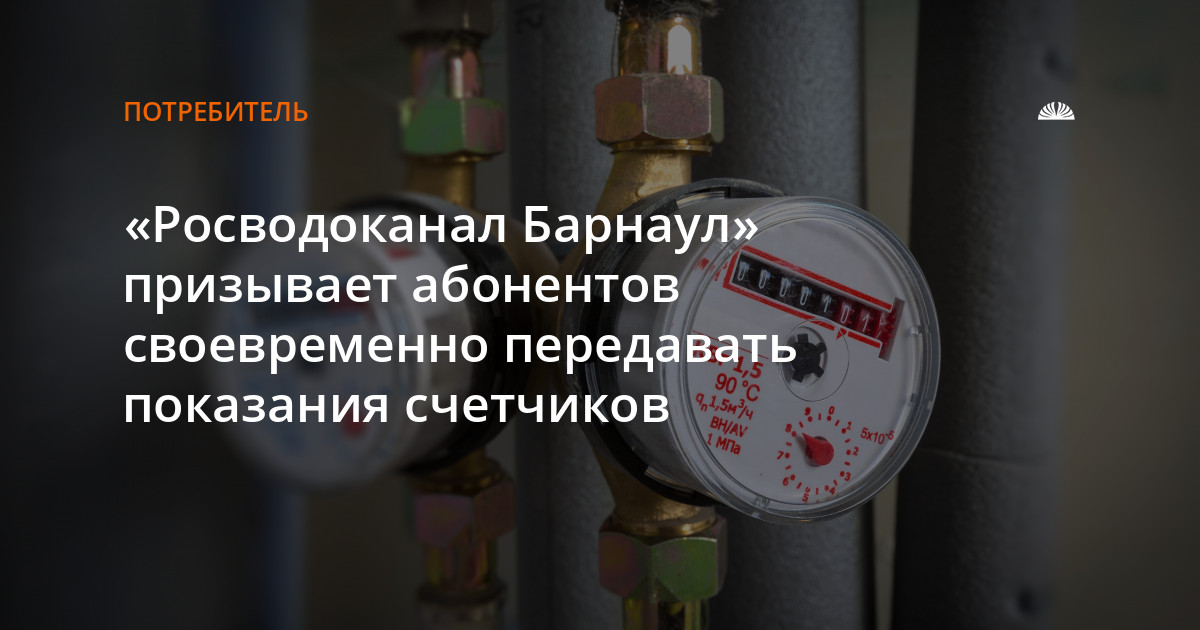 Передавать показания можно любым удобным способом - в личном кабинете сайта системы «Город» www.sistemagorod.ru, по номеру телефона 43-22-22 (голосовой сервис приема показаний), по номеру телефона 99-50-55 (автоматический сервис), по номеру кол-центра 50-01-01 (далее нажать клавишу «2»), на сайте водоканала barnaul.rosvodokanal.ru, смс-сообщением на номер 8-903-767-2230, а также с помощью мобильного приложения «РВК.Услуги».