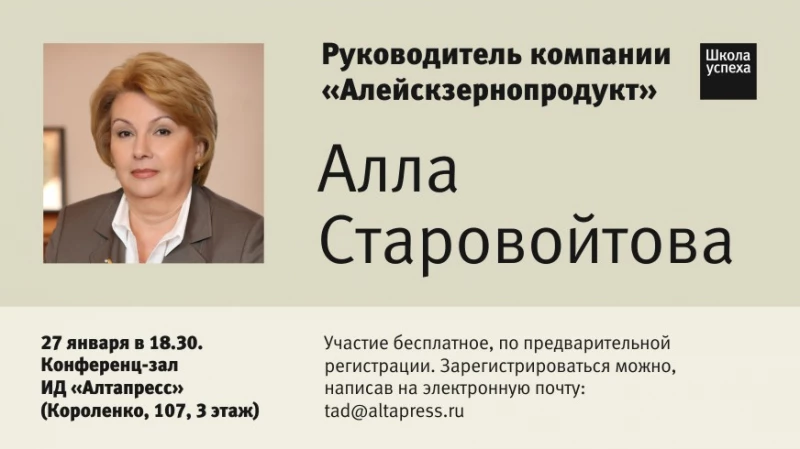 Общение с Аллой Старовойтовой состоится 27 января в конференц-зале ИД "Алтапресс" (ул. Короленко, 107, 3-й этаж). Начало в 18-30. Вход свободный. Предварительно необходимо зарегистрироваться, написав на электронную почту: tad@altapress.ru.