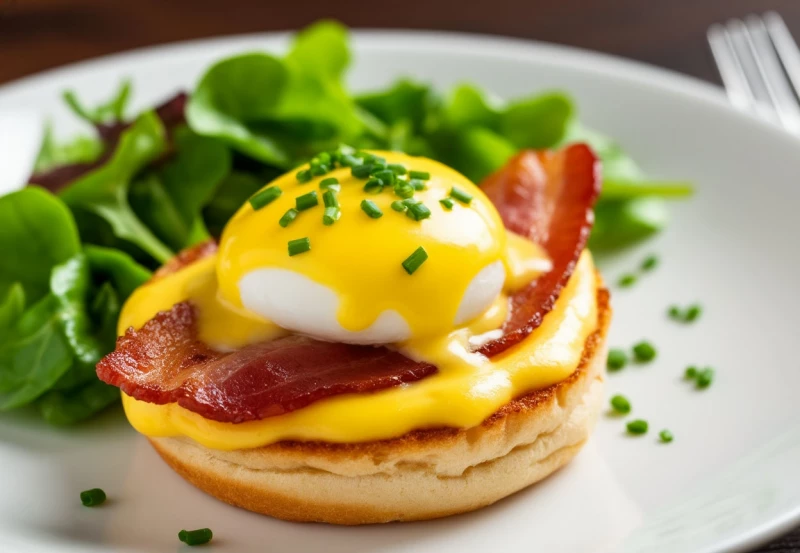 4. Сборка. На поджаренную основу выложите сначала белковую часть (бекон, грибы или рыбу), сверху — яйцо пашот. Полейте теплым соусом голландез, украсьте зеленью, щепоткой паприки или тёртой лимонной цедрой.