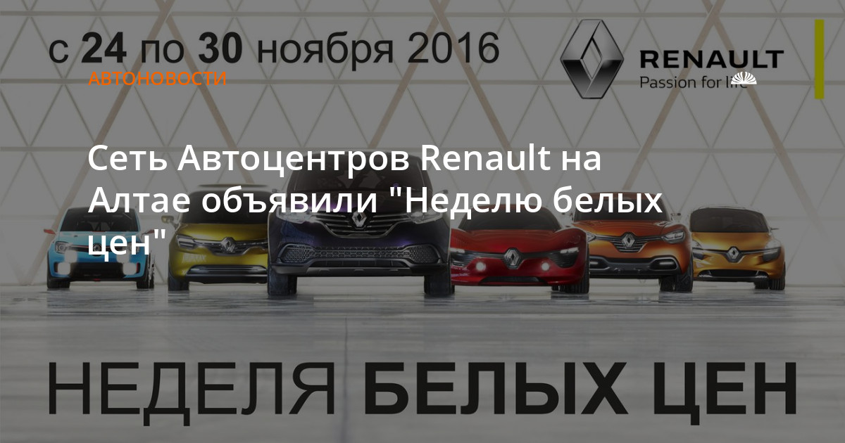 Акция от дилеров Renault совпадает по времени со всеобщей "черной пятницей". Однако называется она в пику глобальной распродаже "Неделей белых цен". И это не случайно. Так продавцы Renault подчеркивают, что они не поднимают предварительно цены для того, чтобы во время распродажи фиктивно ее снизить — все по-честному. Более того, представители марки всячески стараются в течение года не допускать роста значений на ценниках.