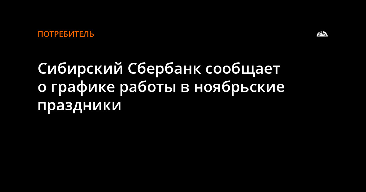 Обслуживание клиентов в субботу, 4 ноября, будет производиться только в дежурных офисах банка по сокращенному графику; в воскресенье, 5 ноября, выходной день; в понедельник, 6 ноября, отделения Банка будут работать по графику субботы. Начиная с 7 ноября, офисы Сибирского банка будут работать в штатном режиме.