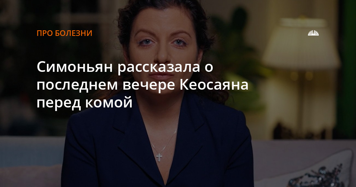 Симоньян уверена, что онкология у нее появилась после того, как стало известно о тяжелой болезни мужа. В конце декабря 2024 года режиссер из-за сердечной недостаточности пережил клиническую смерть. Несколько месяцев он оставался в коме, после чего в сентябре прошлого года скончался.