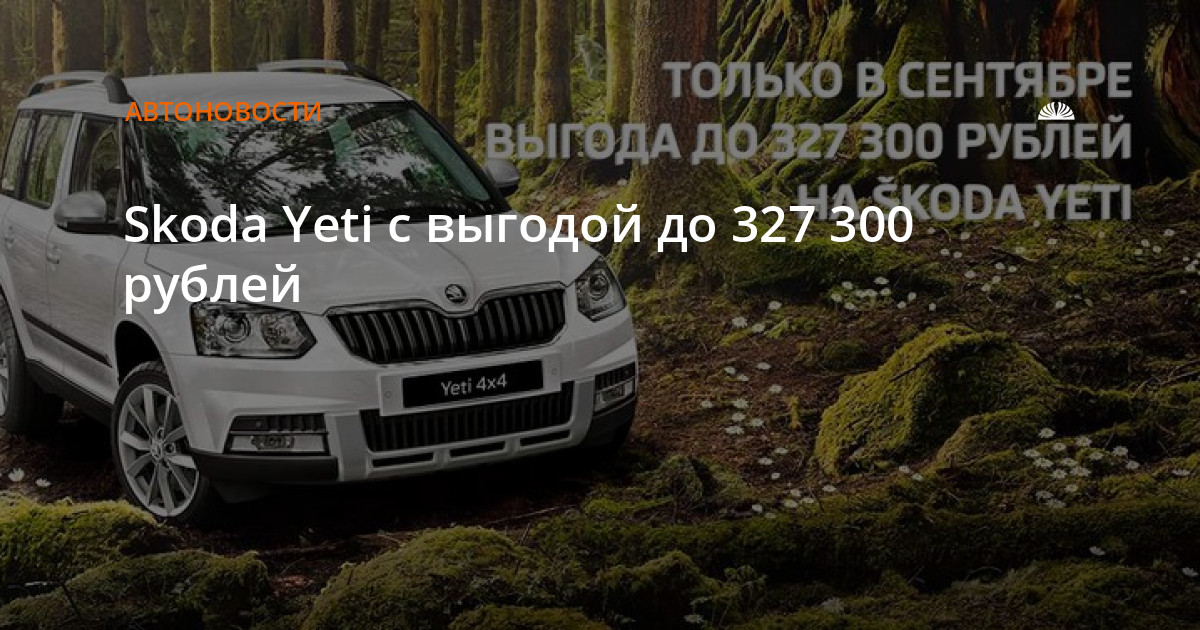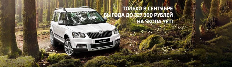* Максимальная выгода достигается при покупке Yeti комплектация Ambition Outdoor (Амбишен Аутдор) 4х4 с пакетом WS4, 2016 года выпуска и участии в программе trade-in (трейд-ин) (обмен старого автомобиля на новый). Информация действительна на момент публикации.