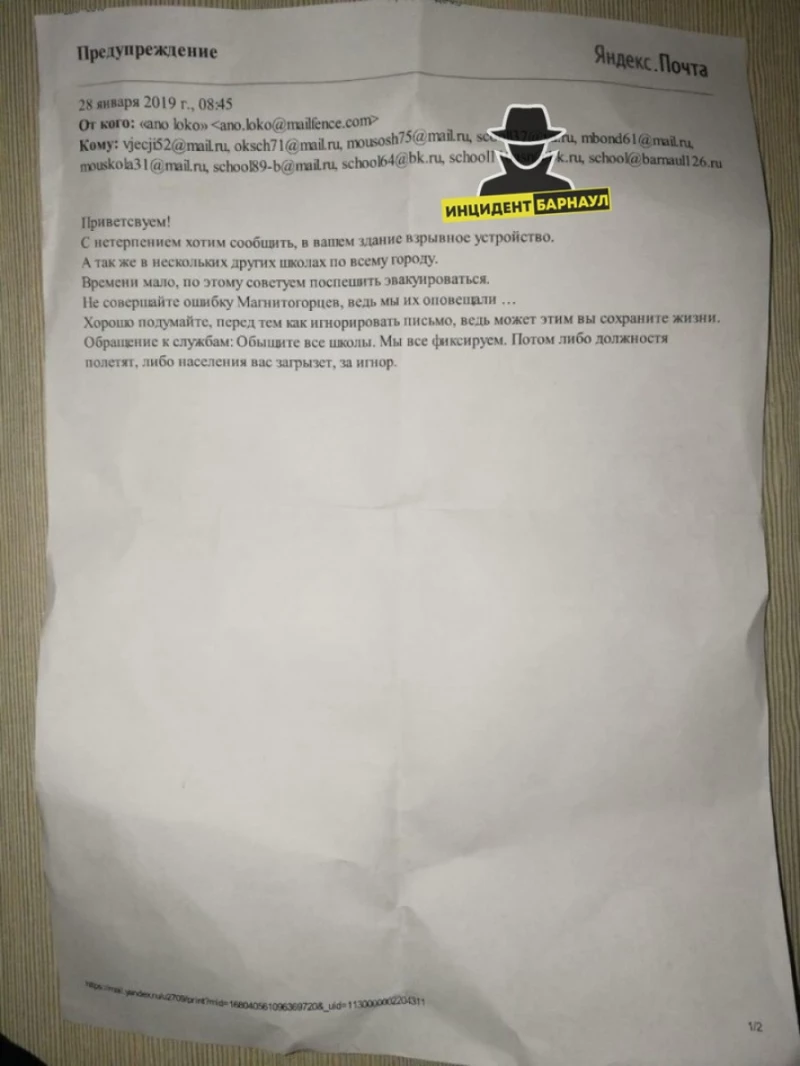 В Барнауле утром 28 января на электронные адреса 29 школ и 11 административных зданий города поступили сообщения о минировании. Эвакуацию проводили в 18 городских школах.