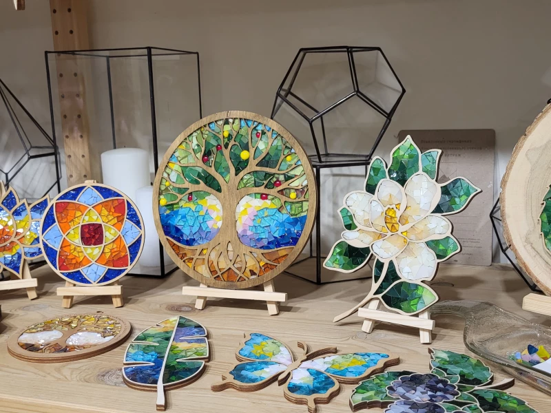 Ассортимент изделий в студии «Алтай Витраж» отличается большим разнообразием. Они выпускают наборы, в которых есть елочные игрушки, панно, картины и небольшие фигурки, предназначенные для сборки как детьми, так и взрослыми.