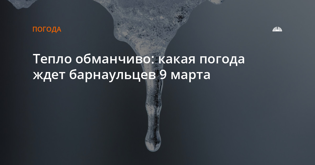 По данным за 10 лет, 9 марта в Барнауле обычно морозный и снежный день. Средняя температура днем составляет -2 градуса, ночью -10. В этом году будет заметно теплее. Восход солнца в 07:54, закат в 19:16, световой день продлится 11 часов 22 минуты.