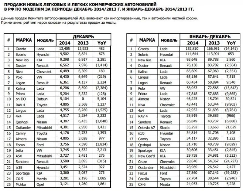 Lada Granta уверенно лидировала в списке бестселлеров в течение всего года, за исключением ноября, когда отечественный автомобиль обогнал "кореец" Kia Rio. Однако уже в декабре Granta вернула себе первое место с результатом 13 405 проданных авто, что превосходит показатели Rio более чем на 4 тыс. По итогам года Kia Rio оказался на третьей строчке рейтинга уступив Hyundai Solaris.