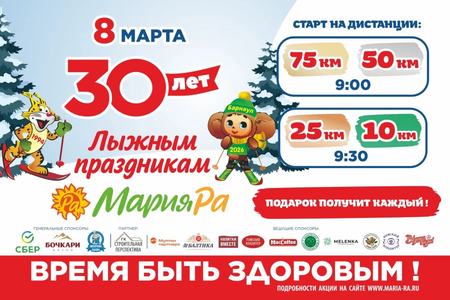Но главный сюрприз ждет тех, кто покорит 50 и 75 км. Среди них разыграют 300 ценных призов. И каждый вид подарка будет представлен ровно в 30 экземплярах — в честь 30-го юбилея. Итоги подведут 9 марта в прямом эфире телекомпании «Катунь 24» в 20:00.
