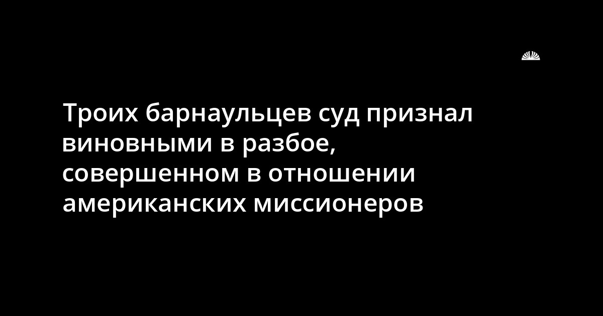 Троих 18-летних барнаульцев суд Октябрьского района Барнаула признал виновными в разбойном нападении и причинении вреда здоровью средней тяжести двум американским гражданам, занимающимся религиозной миссионерской деятельностью. Приговор вступил в законную силу.