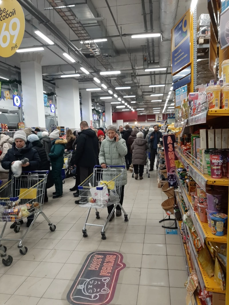 Тележки для товаров расхватывают мгновенно. На входе остается одна или две, которые тоже через несколько минут возьмет спешащий житель города.