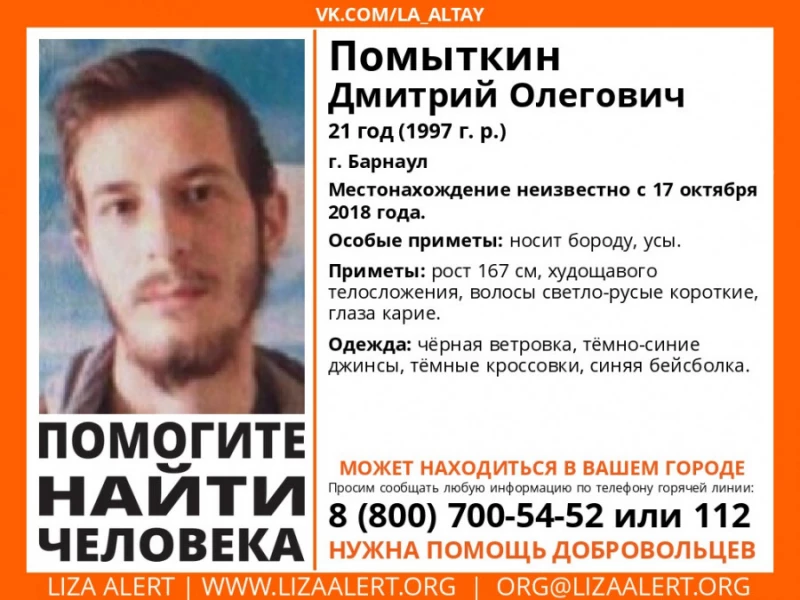 В Алтайском крае в октябре 2018 года пропал 21-летний Дмитрий Помыткин. Молодого человека до сих пор ищут, пишут в группе «Лиза Алерт».