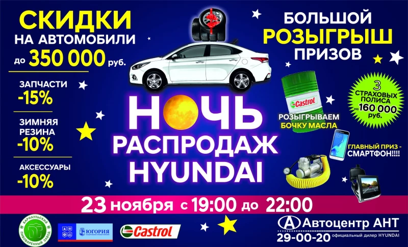 Организатор ООО "АНТ 2000". ИНН/КПП 2222062354/222201001. Сроки акции 23 ноября 2017г с 19.00 до 22.00. Максимальный размер скидки достигается при участи в программе Trade In Hyundai и с учетом специальной скидки от дилера. Подробную информацию о правилах проведения розыгрыша, количестве призов или выигрышей, сроках, месте и порядке их получения - по телефону 29-00-20.