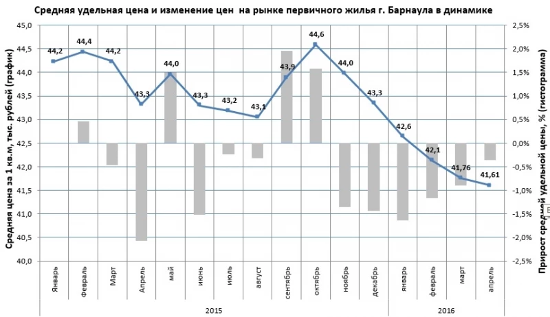 Отметим, что застройщики Барнаула заявляют о том, что стоимость квадратного метра не меняется с прошлого года. Снижение есть только в рамках специальных рекламных акций. Однако по итогам первого квартала 2016 года "Мир квартир" отметил, что Барнаул стал вторым по темпам падения цен на новостройки среди российских городов (портал изучает цены в 62 городах). Квартиры в новых домах краевой столицы подешевели на 11,3%. Стоимость квадратного метра по версии "Мира квартир" составила 37,9 тысячи рублей.