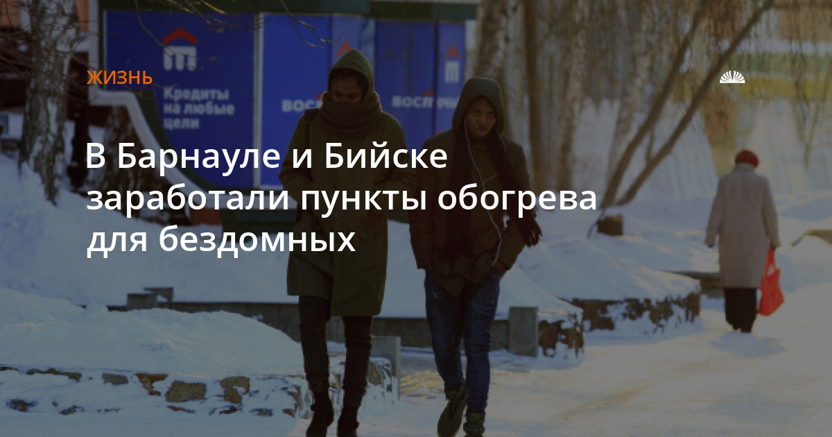Министерство социальной защиты Алтайского края организовало работу пунктов обогрева для лиц без определенного места жительства. Площадки развернули на базе учреждений социального обслуживания, в Центральном доме‑интернате для престарелых и инвалидов в Барнауле и в Бийском доме‑интернате для престарелых и инвалидов.