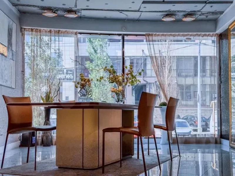 Среди особенностей помещения — панорамные французские окна‑витрины, которые наполняют пространство естественным светом и создают атмосферу воздушной элегантности.