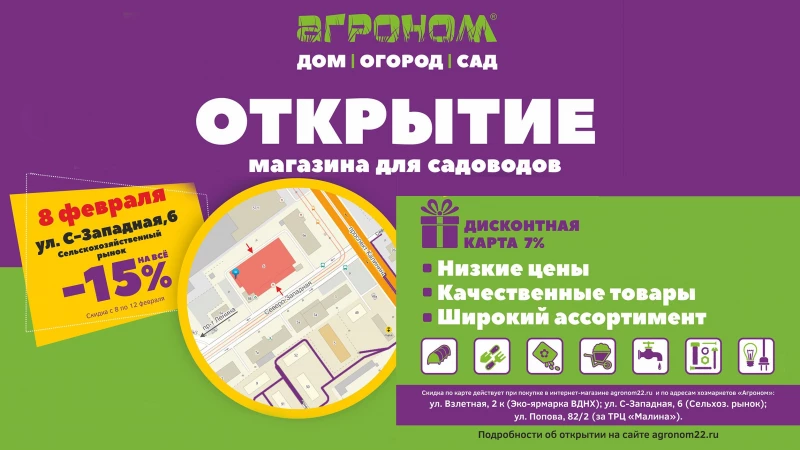 Все покупателям в день открытия предоставляется скидка 15% на весь ассортимент.