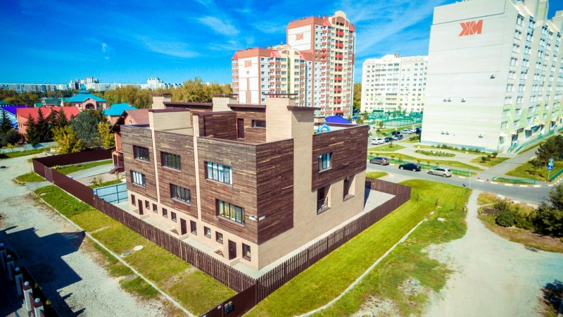 Здание выполнено в современном скандинавском стиле. Дом разделен на три блок-секции площадью 315 кв.м.