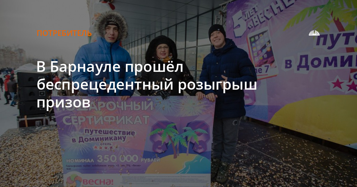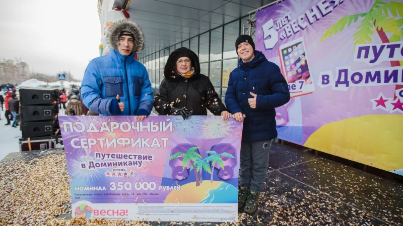 В канун Нового года и по случаю пятилетия торгово-развлекательный центр остался верен традиции - дарить клиентам сказочный праздник. Каждый, кто совершил покупку на сумму от трех тысяч рублей в период с 18 октября по 24 декабря, cмог выиграть приятный подарок. В числе прочего, седьмой айфон, айпад, стиральную машину, микроволновую печь, пылесос, кухонный комбайн, и, конечно, главный приз - туристическую путевку в Доминиканскую Республику в пятизвездочный отель.