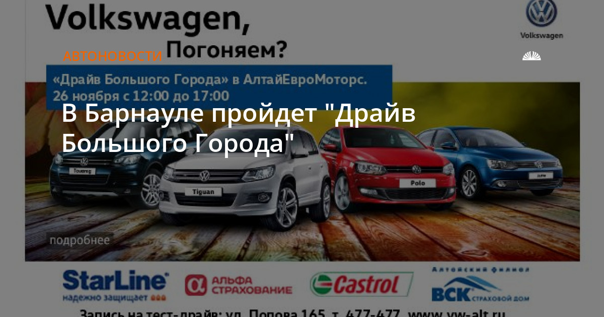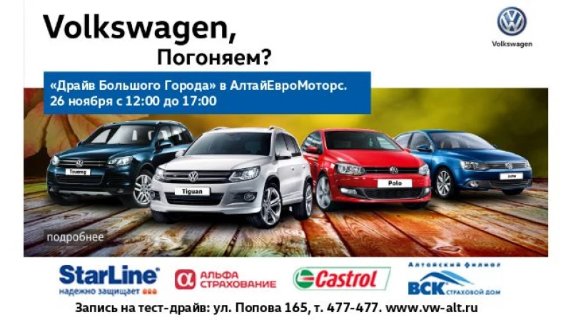 Организатор розыгрыша: ООО "АлтайЕвроМоторс", официальный дилер Volkswagen в Алтайском крае. Срок проведения розыгрыша: 26 ноября 2016 года. Подробную информацию о правилах проведения розыгрыша, количестве призов или выигрышей, сроках, месте и порядке их получения можно узнать по тел: 477-477 или по адресу: ул. Попова, 165