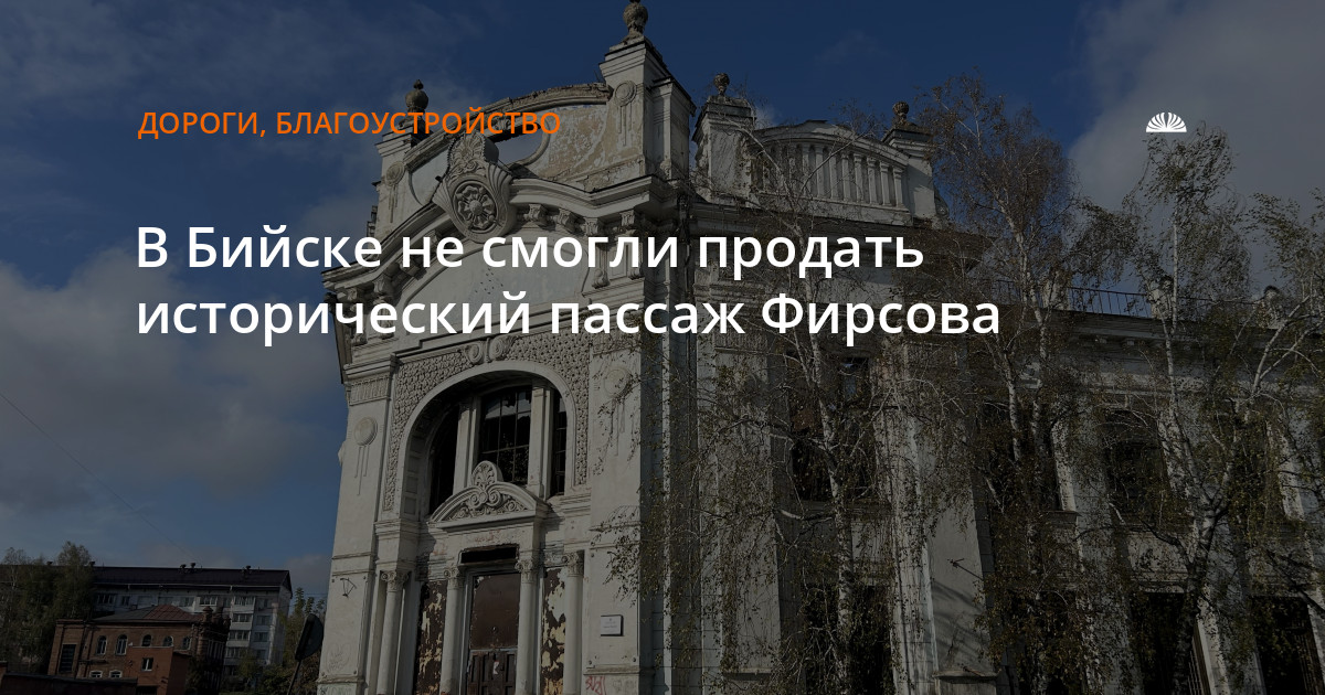Пассаж Фирсова в Бийске, который является объектом культурного наследия, так и не нашел нового владельца — аукцион по его продаже не состоялся из‑за отсутствия заявок. По информации ГИС «Торги», на участие не было подано ни одной заявки.