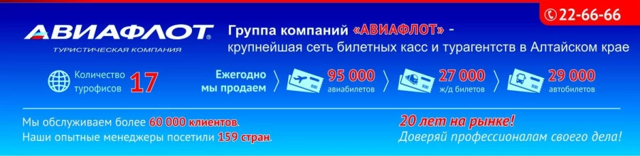 Группа компании "Авиафлот" — крупнейшая сеть билетных касс и турагентств в Алтайском крае. "Авиафлот" – лидер по продаже авиабилетов более 20 лет.