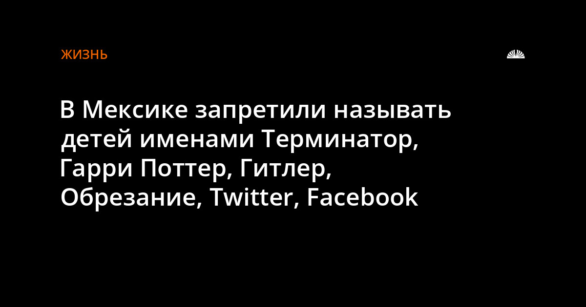 В мексиканском штате Сонора приняли закон, запрещающий регистрировать новорожденных детей под смешными или уничижительными именами. В запретный список вошло 61 имя. Среди них – Терминатор, Рэмбо, Бэтмен, Джеймс Бонд, Гарри Поттер, Гитлер, Бургер Кинг, Рождество, Обрезание, Twitter и Facebook.