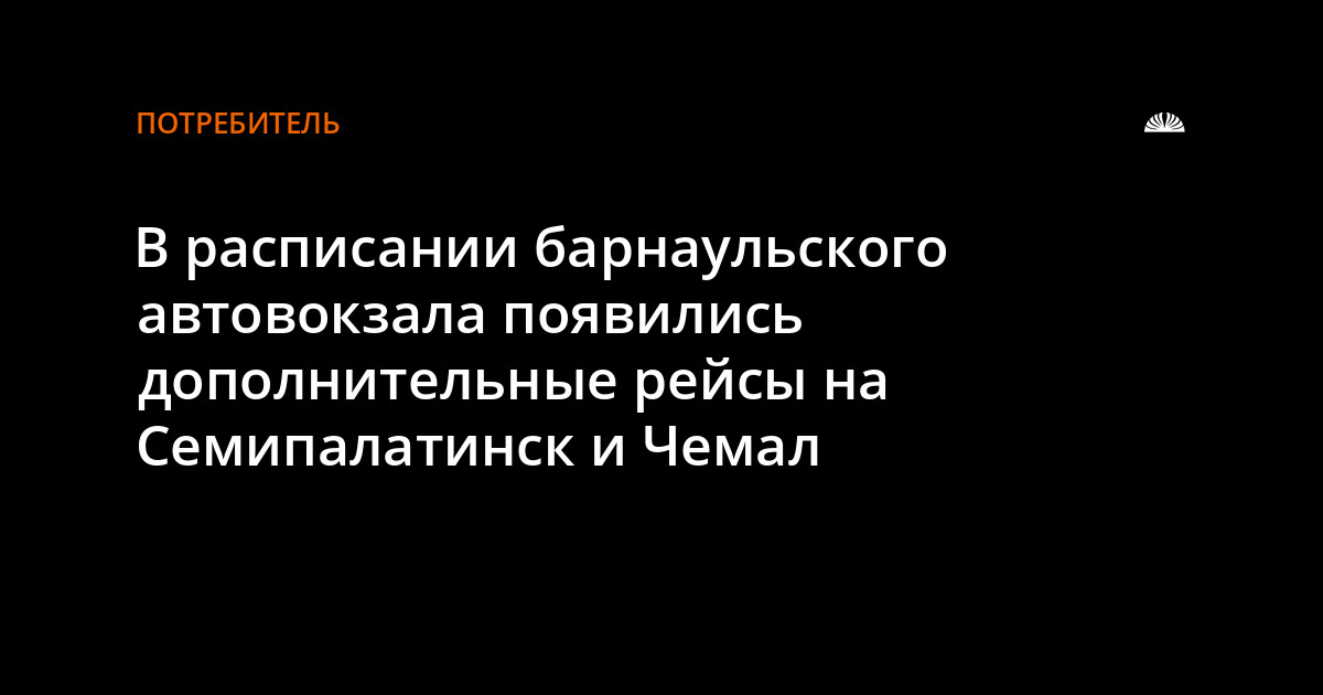С 4 июня в расписании автовокзала Барнаула открыт дополнительный рейс по маршруту "Барнаул-Чемал", время отправления в 8-30 ежедневно. С 3 июня рейс "Барнаул - Семипалатинск" оправлением 20-20 будет выполняться ежедневно.
